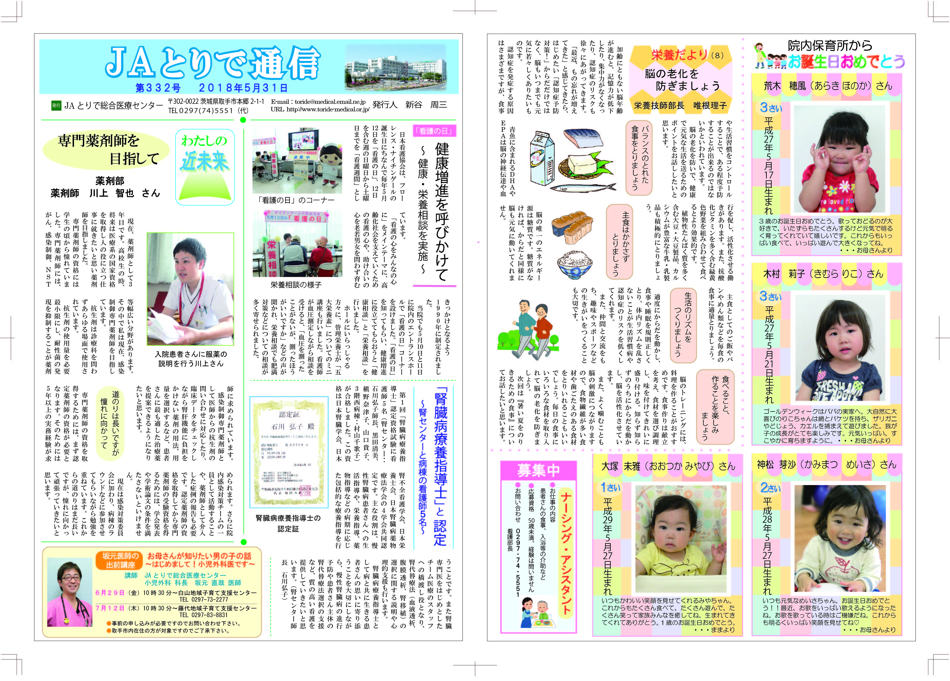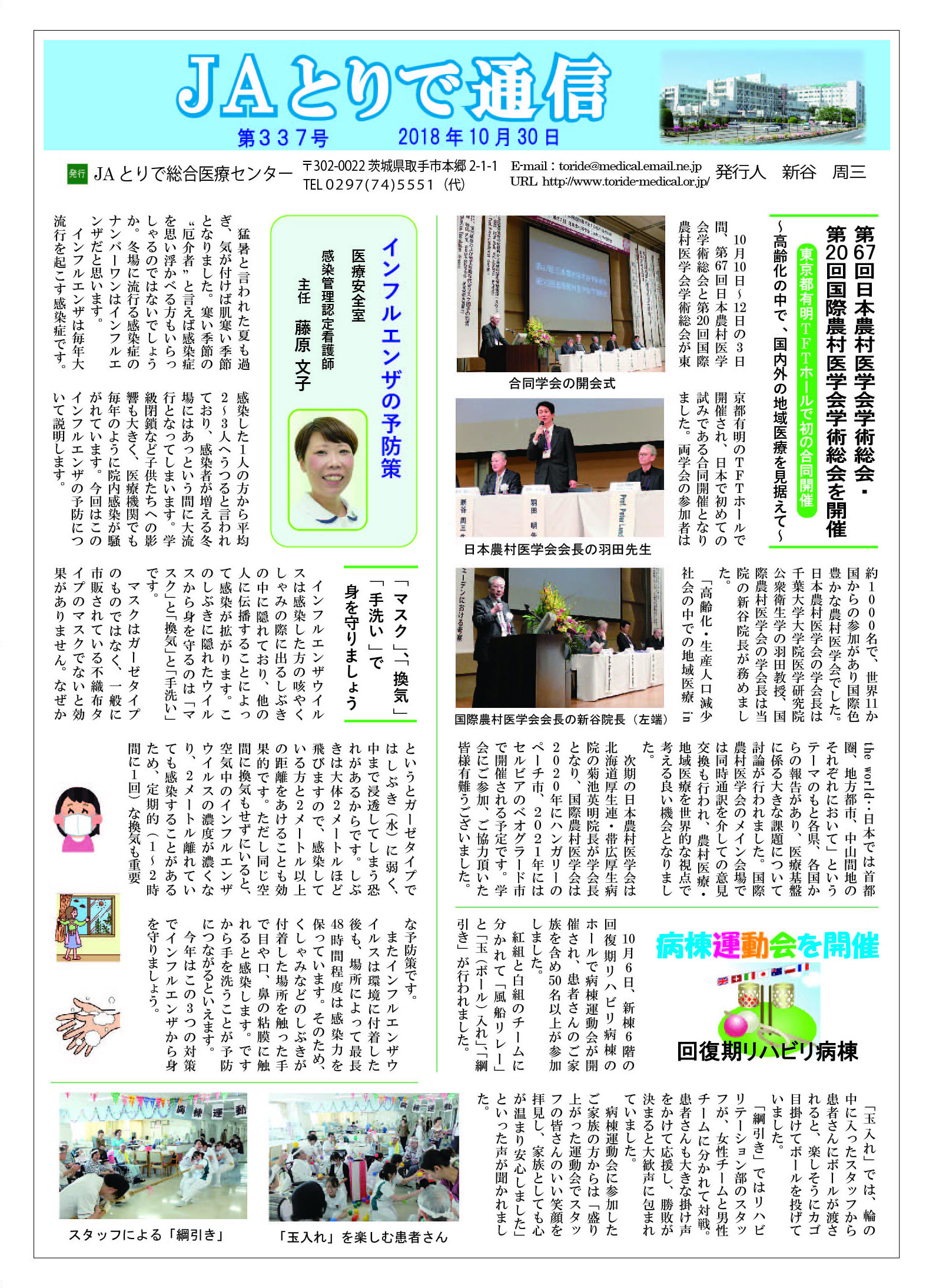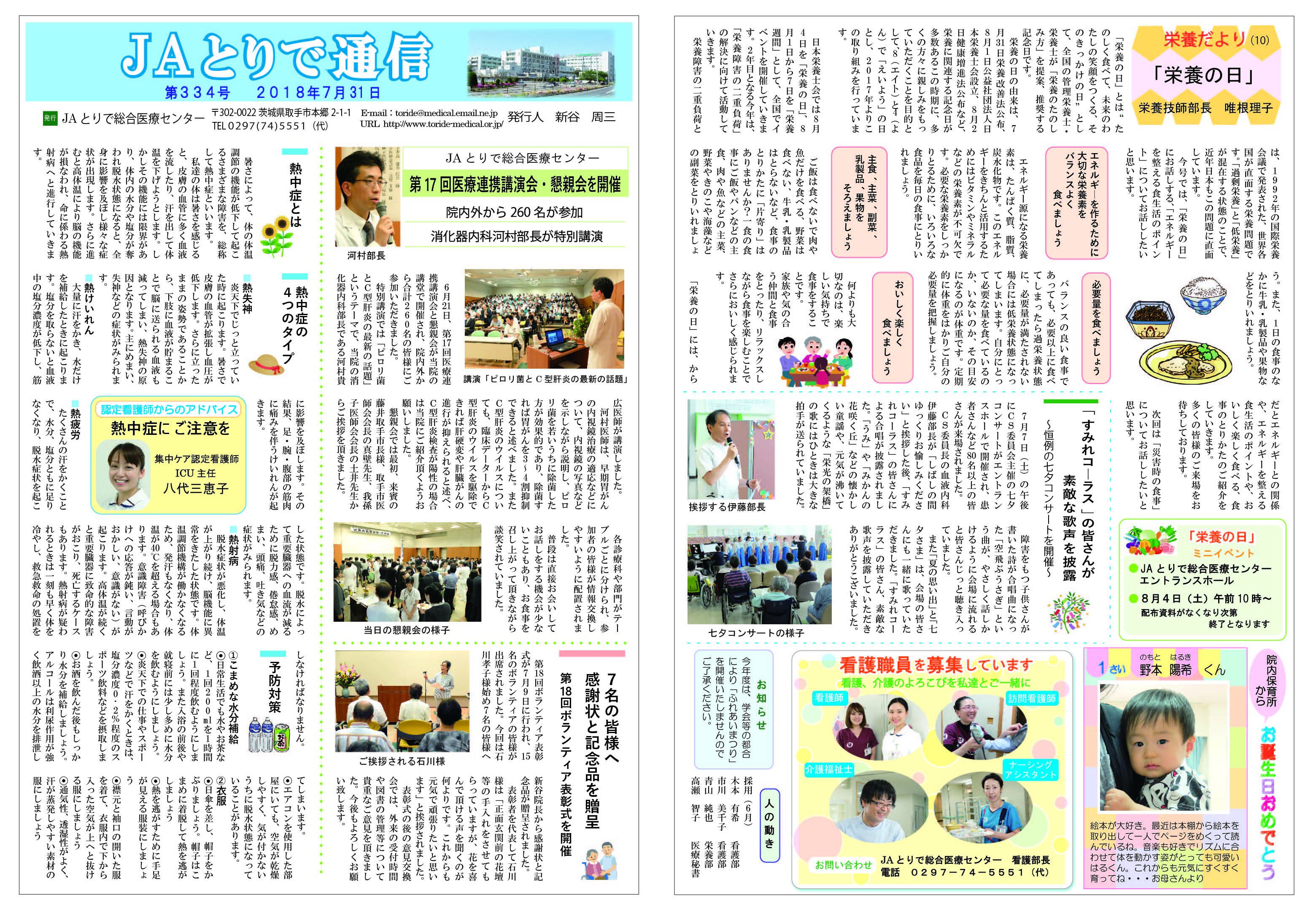 特集 感染対策委員会のご案内 全国厚生連栄養士協議会 全国統一献立 おすすめ郷土料理 茨城県そばいなり 連携医のご紹介 しばたキッズクリニック 院長 柴田佐和子 新人のご紹介 4階西病棟 病院のうごき ・第24回医療連携講演会・懇親会を開催 ・売店前のトイレにベビーシート(おむつ交換台)を設置 お知らせ ・各外来に呼出番号表示盤を設置します ・「JAとりで健康講話」2025年9月6日 ・祝日の月曜日の一部を開院します |