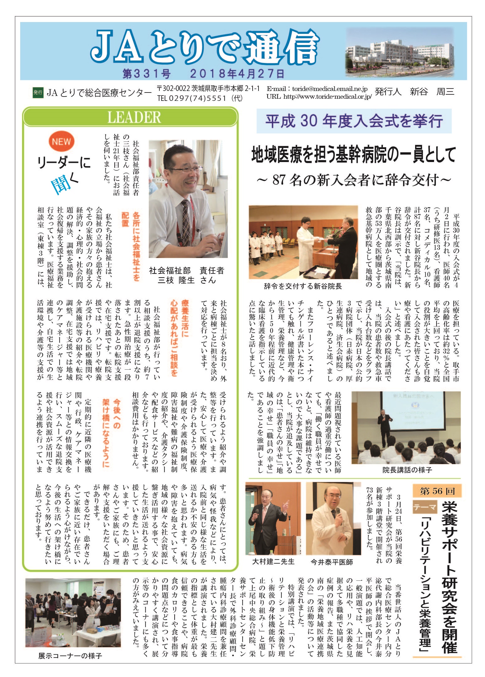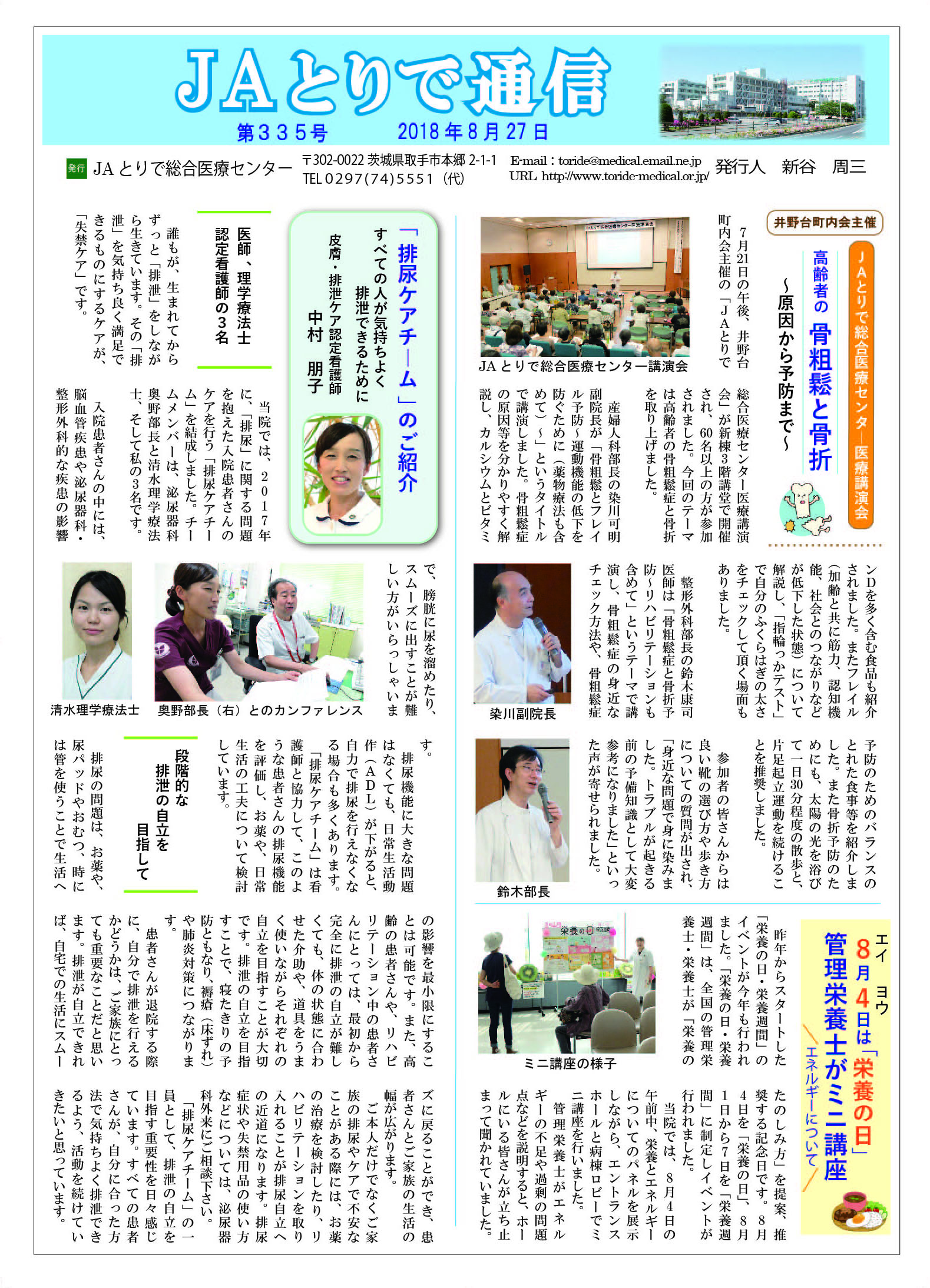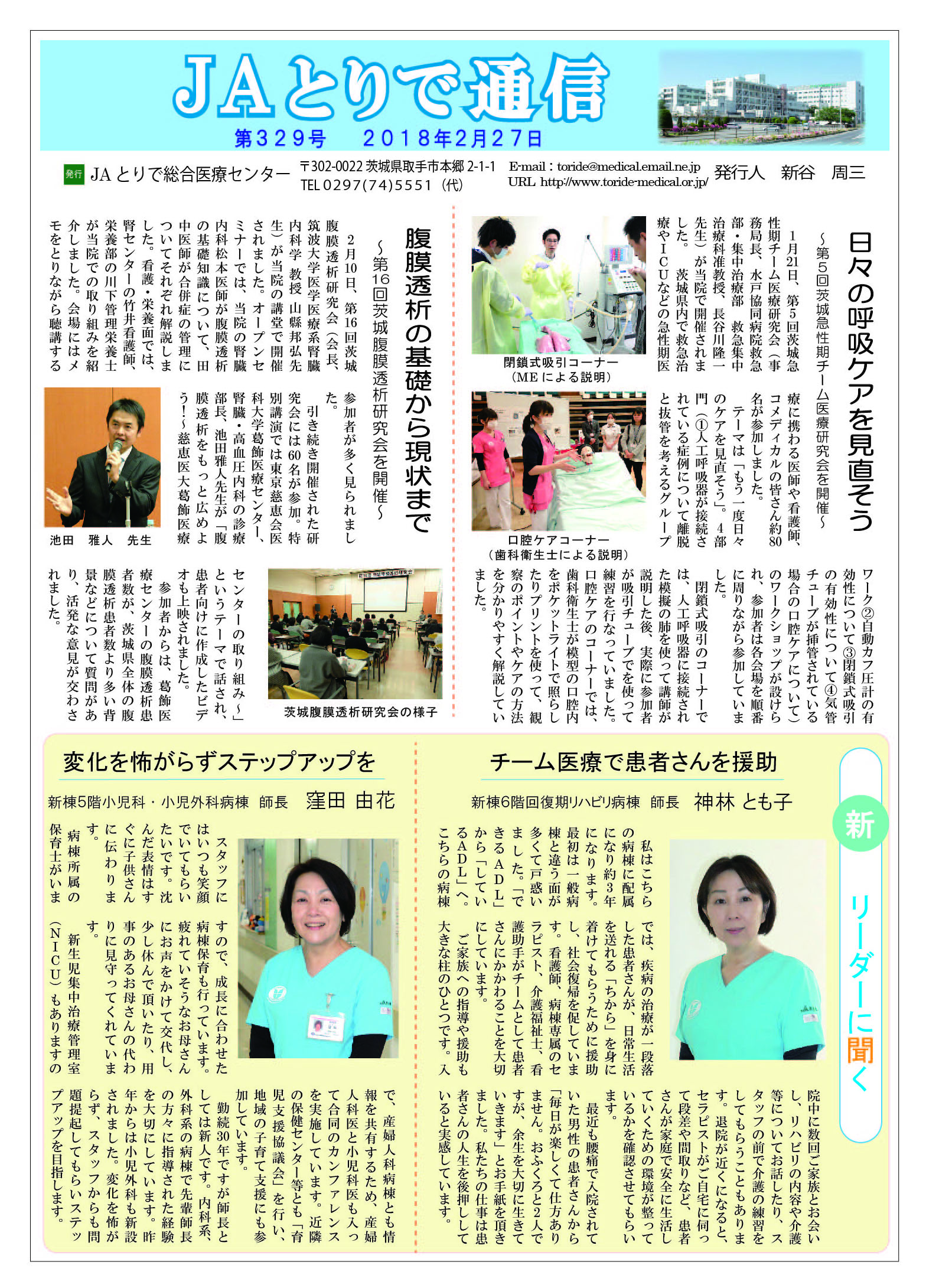 特集 感染対策委員会のご案内 全国厚生連栄養士協議会 全国統一献立 おすすめ郷土料理 茨城県そばいなり 連携医のご紹介 しばたキッズクリニック 院長 柴田佐和子 新人のご紹介 4階西病棟 病院のうごき ・第24回医療連携講演会・懇親会を開催 ・売店前のトイレにベビーシート(おむつ交換台)を設置 お知らせ ・各外来に呼出番号表示盤を設置します ・「JAとりで健康講話」2025年9月6日 ・祝日の月曜日の一部を開院します |