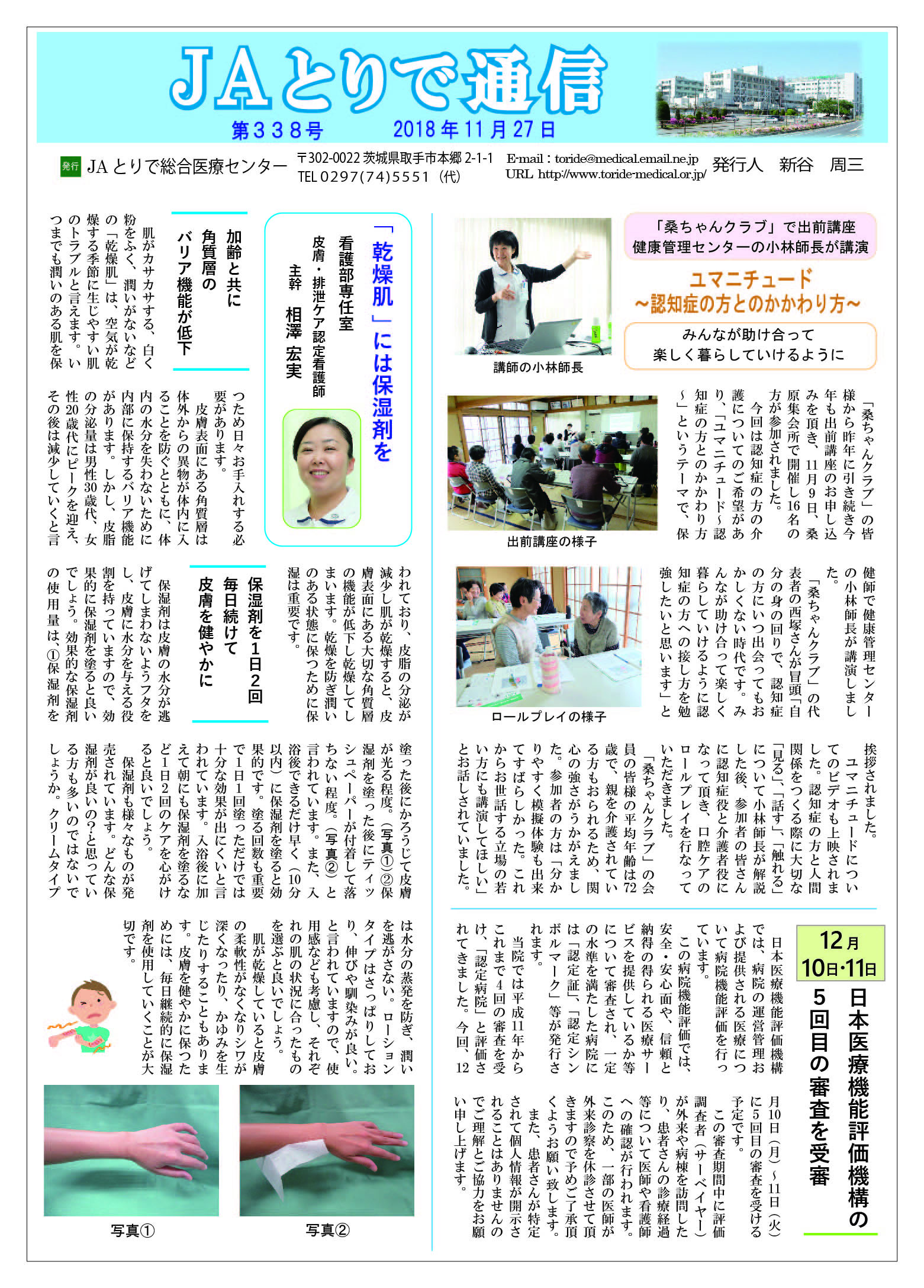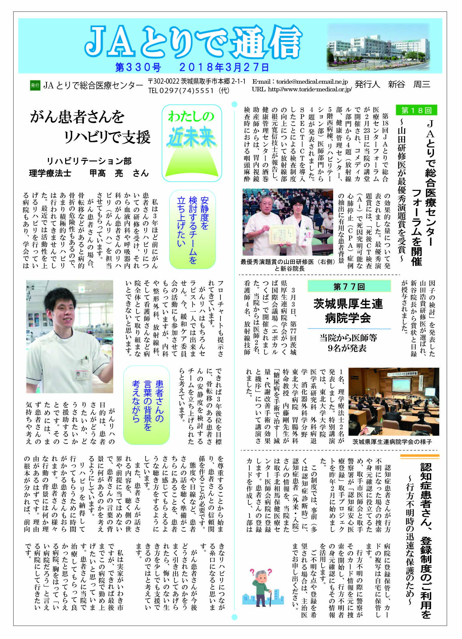 特集 心理職の業務について 健康講話 連載 関節リウマチ(1) 膠原病・リウマチ内科部長 鈴木文仁 連携のご紹介 さくら整形外科クリニック 院長 槌谷宏平 新人のご紹介 4階東病棟 おいしい治療食のレシピ 腎臓病食 JAとりで総合医療センター 栄養部 病院のうごき ・作業療法士の増田さんへ感謝状 ・第44回院内看護研究発表会を開催 ・2024年度看護部ウォードコンペを開催 ・2024年度看護部MVPを5名が受賞 お知らせ ・入院患者さんへの面会を再開しました |