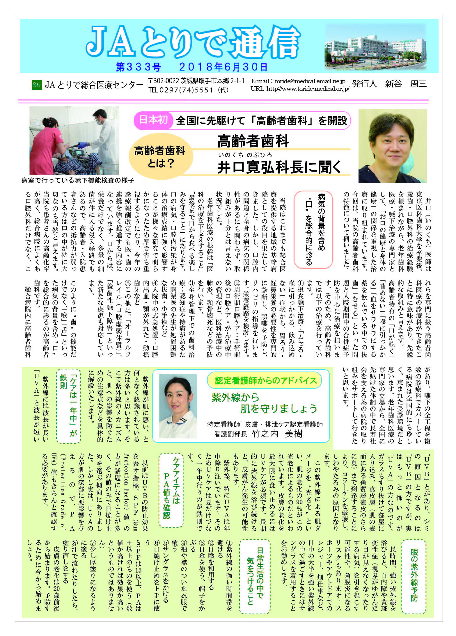 特集 無痛分娩はじめました「安心・安全な除痛を目指して」 連載 老年歯科学講座 航空機能低下症・オーラルフレイル(虚弱口腔) 高齢者(嚥下)歯科科長 井口 寛弘 連携医のご紹介 鈴木内科医院 院長 鈴木博之 新人のご紹介 リハビリテーション部 全国厚生連栄養士協議会 全国統一献立 おすすめ郷土料理 三重県 ほごし寿司 当院でお産した方からのメッセージ 助産師便り ふれあいまつり |