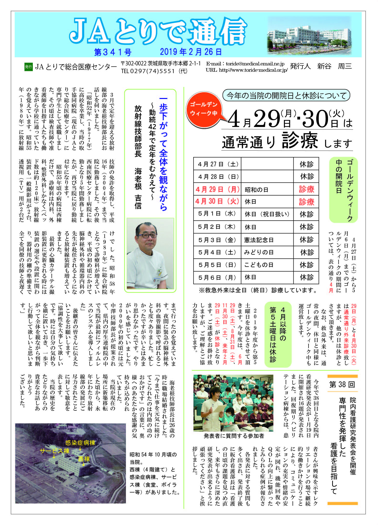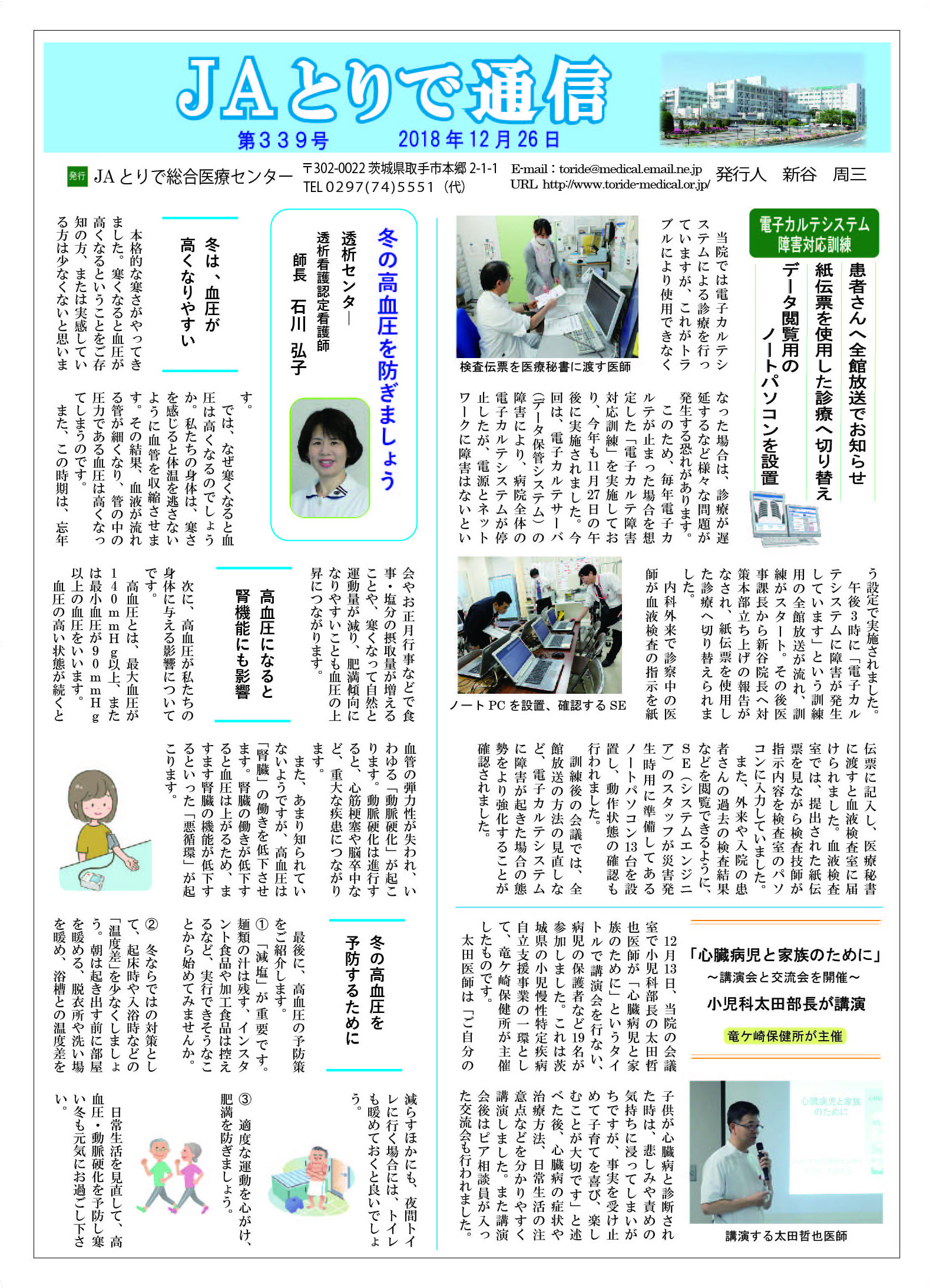 特集 施設課の業務について 健康講話 連載 関節リウマチ(2)膠原病・リウマチ内科部長 鈴木文仁 連携医のご紹介 いしかわ耳鼻咽喉科クリニック 院長 石川敏夫 新人のご紹介 3階西病棟 助産師便り 当院でお産した方からのメッセージ 病院のうごき ・地域医療講演会に約120名参加 ~高齢に向けての準備について熱心に聴講~ ・出前講座で口腔機能をチェック ~第41回ほほえみセミナーで井口寛弘医師が講演~ お知らせ ・祝日の月曜日の一部を開院します ・NSTニュース Vol.1 |