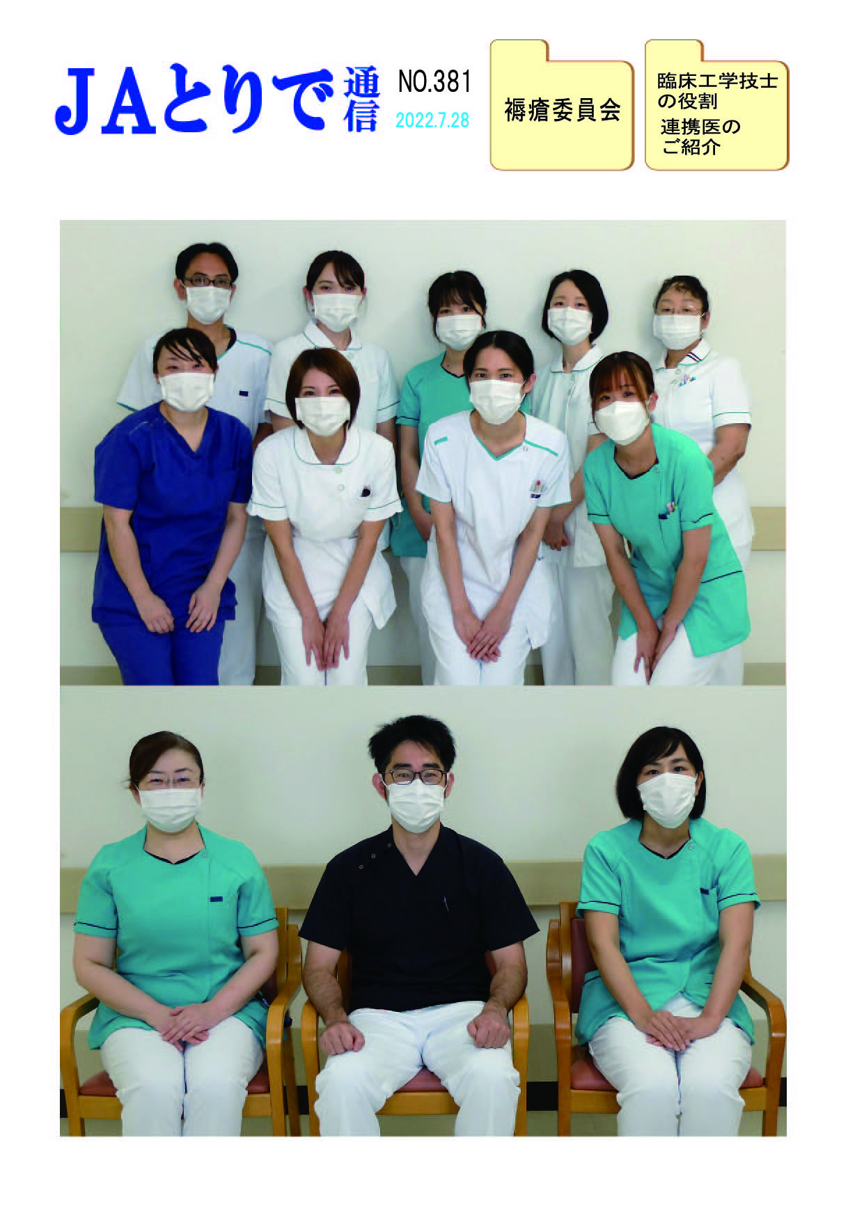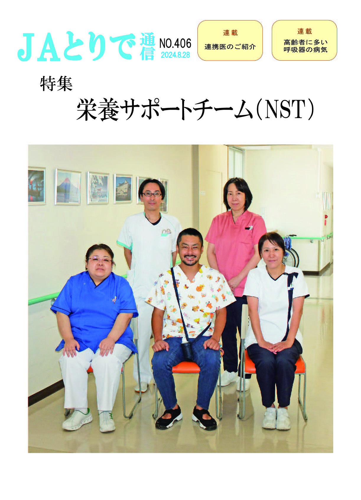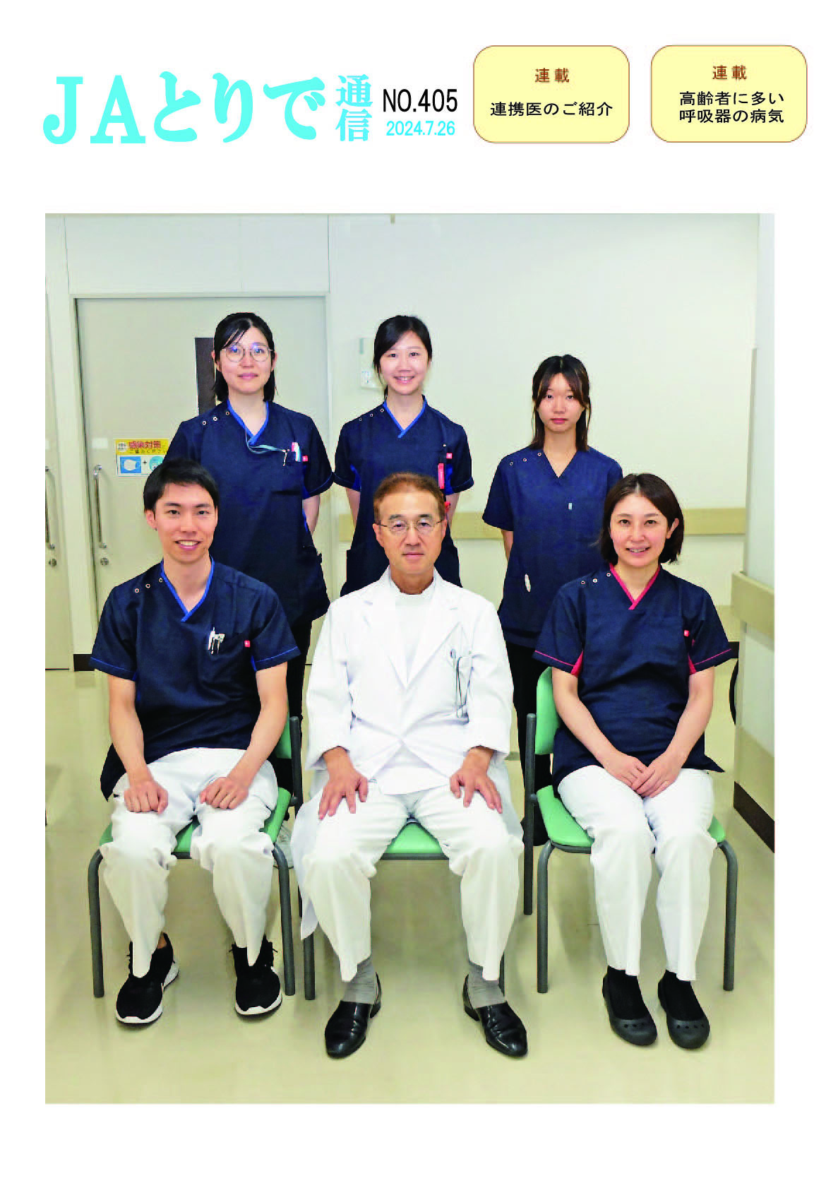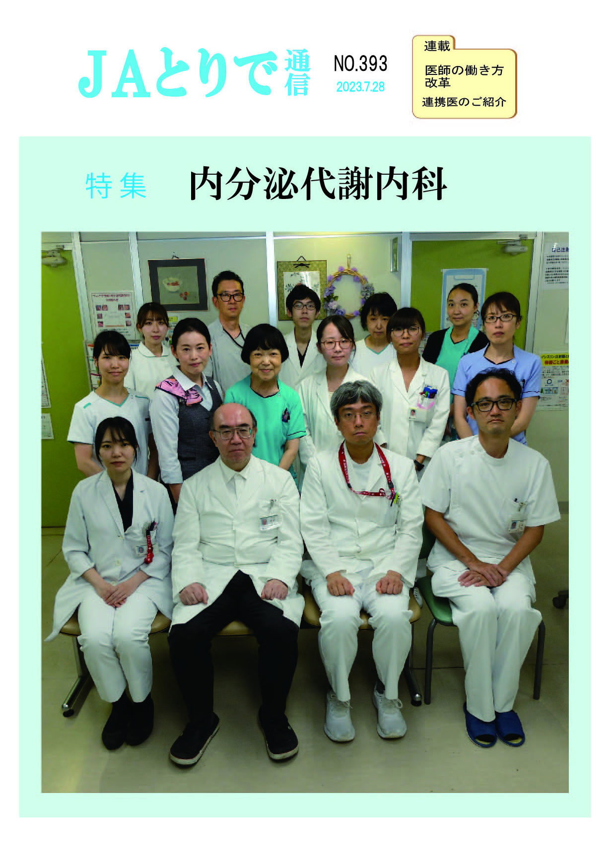 特集 心理職の業務について 健康講話 連載 関節リウマチ(1) 膠原病・リウマチ内科部長 鈴木文仁 連携のご紹介 さくら整形外科クリニック 院長 槌谷宏平 新人のご紹介 4階東病棟 おいしい治療食のレシピ 腎臓病食 JAとりで総合医療センター 栄養部 病院のうごき ・作業療法士の増田さんへ感謝状 ・第44回院内看護研究発表会を開催 ・2024年度看護部ウォードコンペを開催 ・2024年度看護部MVPを5名が受賞 お知らせ ・入院患者さんへの面会を再開しました |