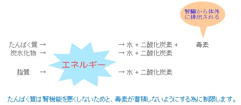 私達が生きるためにはエネルギーが必要です。そのエネルギーは食物のたんぱく質・炭水化物・脂質の3つの栄養素を燃やして得ています。身体の中でこれらの栄養素を燃やすと、いずれからも二酸化炭素と水が発生しますが、たんぱく質だけはさらに尿素窒素などの毒素を発生します。