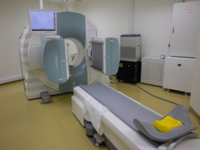 核医学検査(RI検査)は、放射線を出すお薬を体内に投与し、ガンマカメラにて投与されたお薬の分布を画像化する検査です。当院に導入されている装置はSPECT(スペクト)-CT装置で、従来の全身撮影などの撮影に加えて断層像も撮影できるSPECT装置に、解剖学的な情報を多く得ることができる16列のマルチスライスCTを搭載した複合型の装置となっています。
