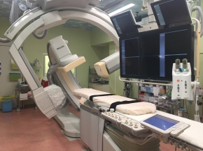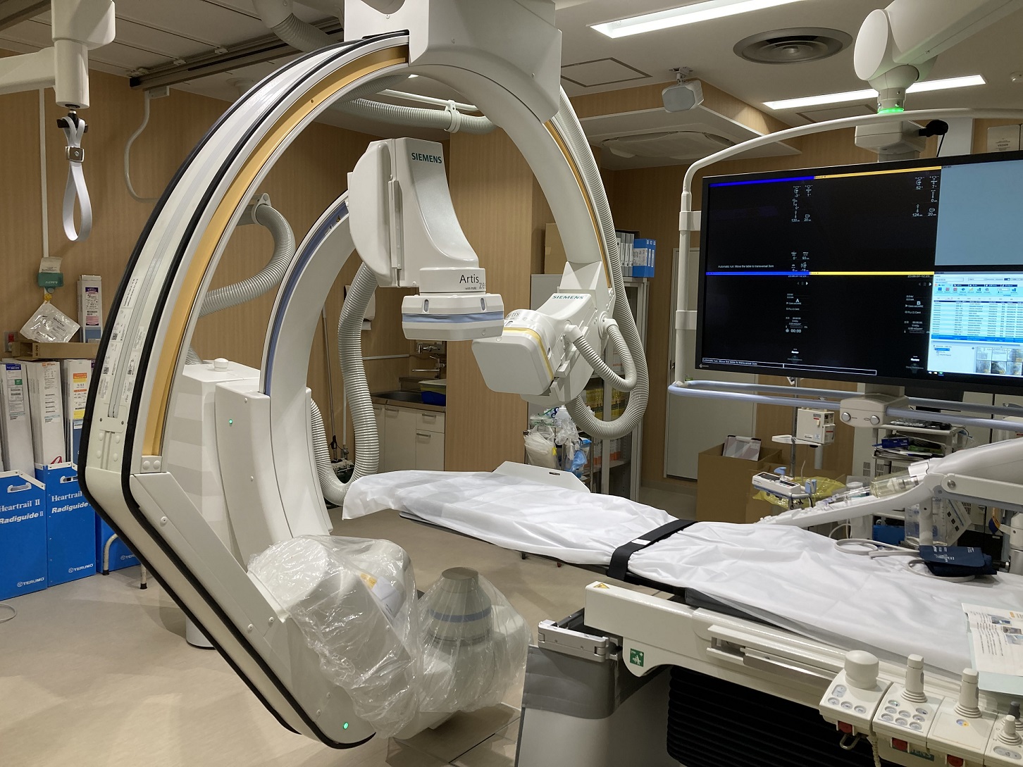 この血管撮影装置は、血管内に細い管(カテーテル)を挿入し、造影剤(レントゲンに映る検査用の薬)を注入する事で、微細な血管病変(狭窄・閉塞等)の診断を可能にします。従来の装置よりも画質が格段に向上した為、検査・治療が効率的に行えます。また、一度に2方向からの撮影が可能な為、使用する造影剤の量と、時間の短縮が可能になりました。さらに、高度のカテーテル治療にも対応可能な装置です。そして従来の装置に比べると、被ばく低減を十分に考慮したシステムになっています。