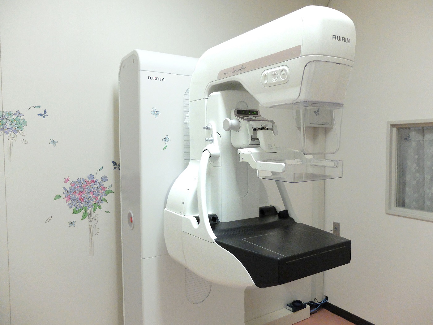 マンモグラフィーとは、乳房専用のX線撮影で、乳房を圧迫板によってはさみ、薄く延ばして撮影します。 当院では、全て女性技師が撮影を行います。