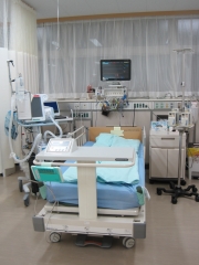 HCUでは、呼吸、循環、代謝その他の重篤な急性機能不全の患者さんを24時間体制で全身管理しています。異常の早期発見や迅速な対応が要求される病棟です。