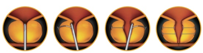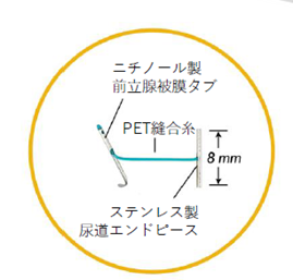 日本では2022年4月から保険診療として認可された、排尿障害に対する新しい低侵襲な治療です。尿道から内視鏡を挿入し、前立腺が位置する尿道の壁から針を刺すと、自動的に糸が前立腺をつかむようにして止まります。(ウロリフトインプラントの挿入)これを4~6か所行うと、肥大した前立腺が糸で圧縮されて尿道が広がり、排尿症状が改善します。