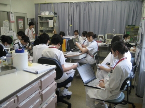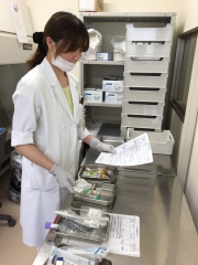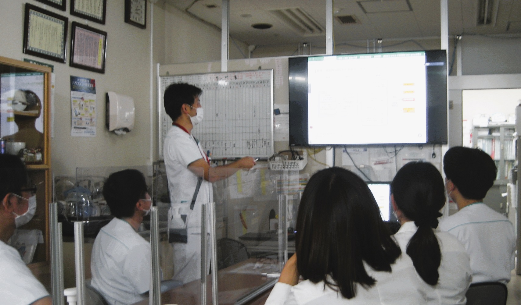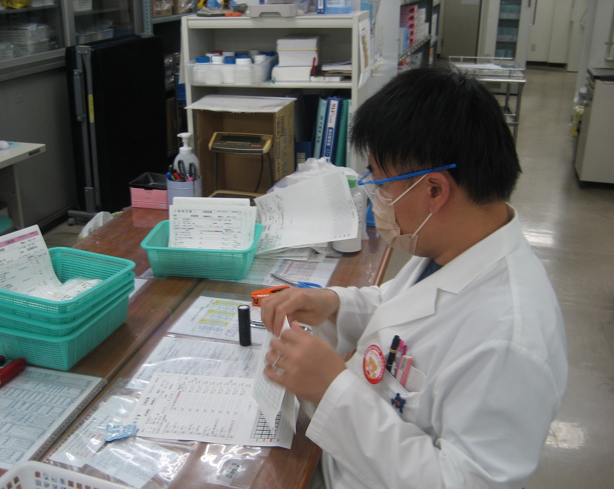 入院患者さんに薬の情報を提供・指導し、また、処方された薬が患者さんに合ったものか・飲み合わせに問題はないかなどをチェックし、副作用の防止・早期発見に努めています。また、医師・看護師・その他の医療スタッフと連携をとり、患者さんに最も適した安全で効果的な薬物療法が行なわれるように、チーム医療の一員として業務に携わっています。