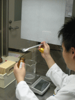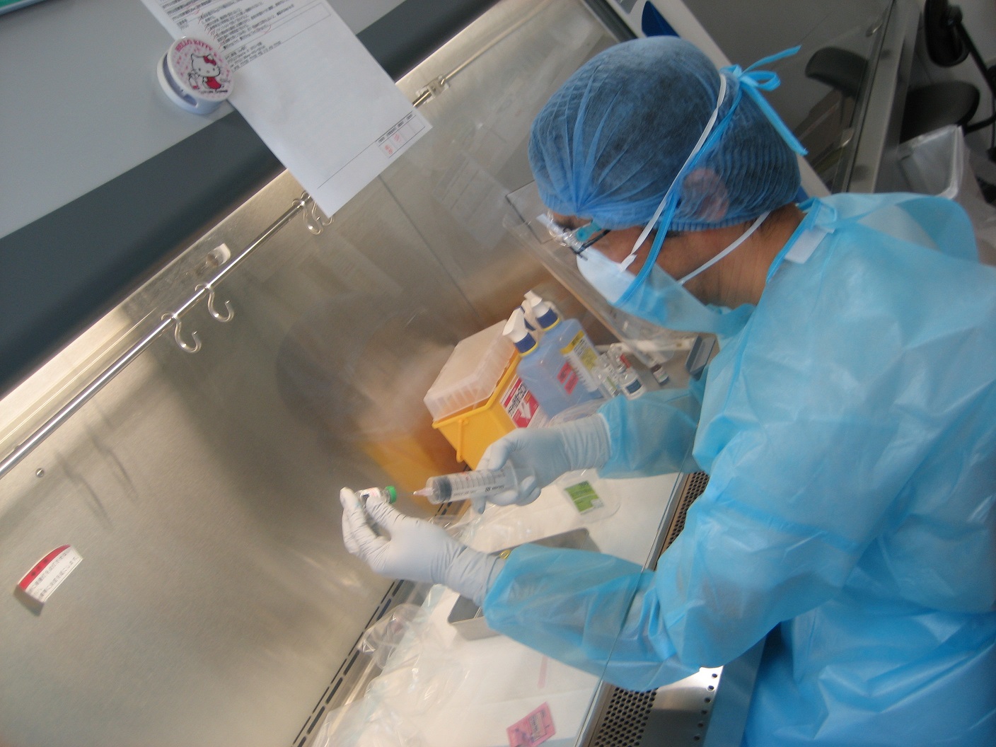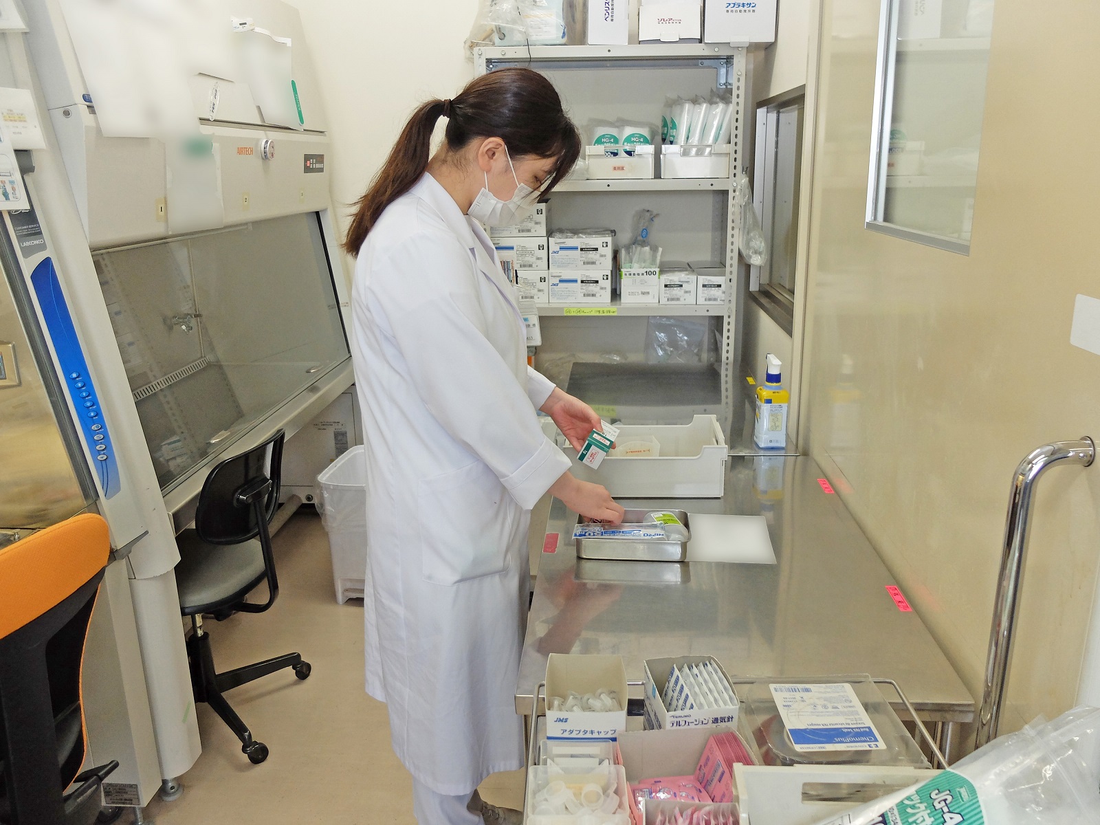 クリーンルームでは抗がん剤や高カロリー輸液の無菌的な調製を行なっています。注射薬の中には、混合すると濁ったり、薬の効力が落ちたりするものもありますので、これらも事前にチェックします。