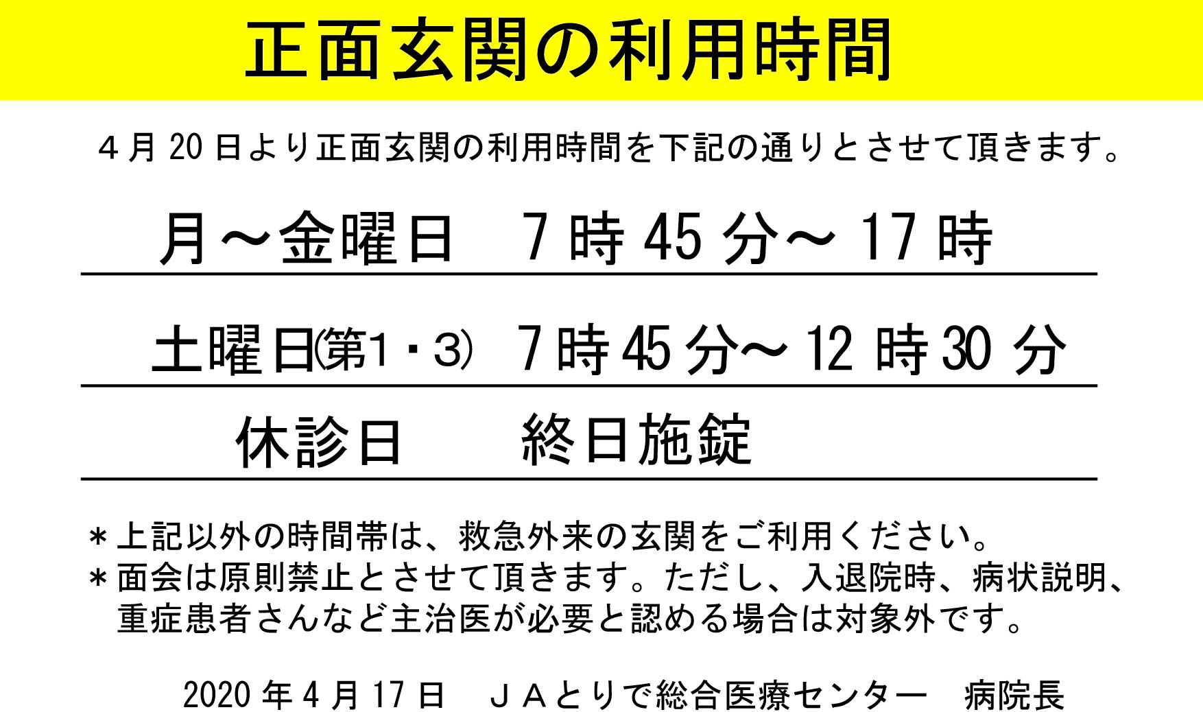 正面玄関の利用時間について - JAとりで総合医療センター|質の高い地域医療・救急医療を提供します