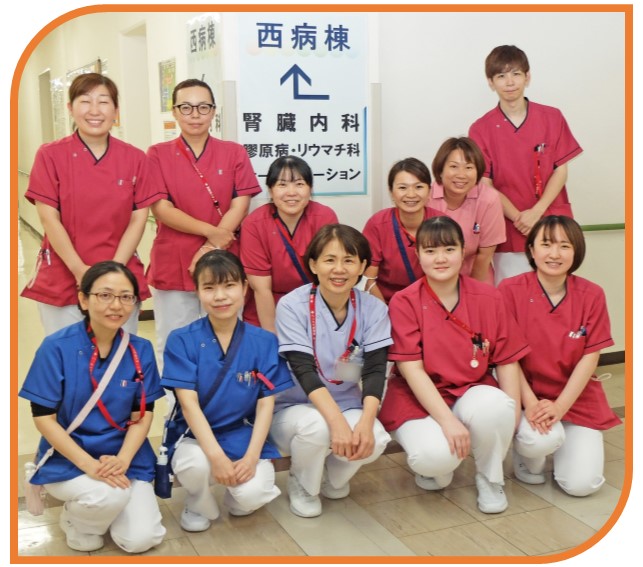 | 4階西病棟は、脳梗塞やパーキンソン病などの脳神経内科疾患の患者さんが主に入院されています。 麻痺や神経症状のある方が多く、医師、看護師、ナーシングアシスタントだけでなく、理学療法士、作業療法士、言語聴覚士とも情報を共有しながら治療やリハビリテーションを実施しています。患者さんの日常生活の援助を通しQOL(生活の質)の向上に努めています。退院後は、患者さんやご家族の笑顔を支えるために一人ひとりに応じた看護提供を心がけています。 |