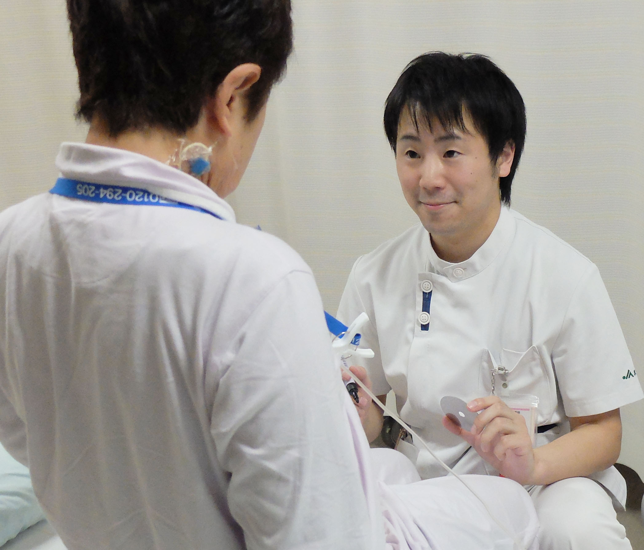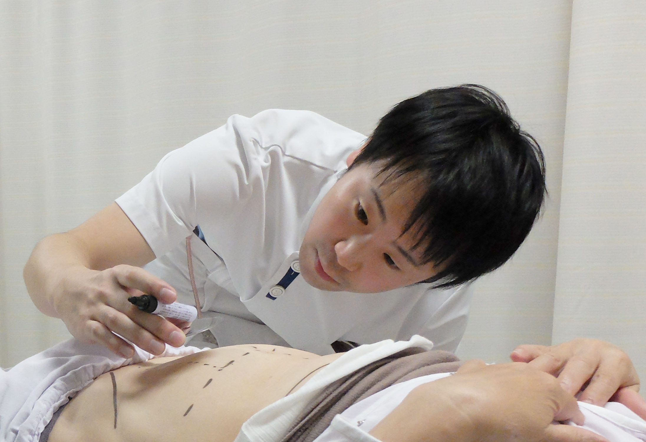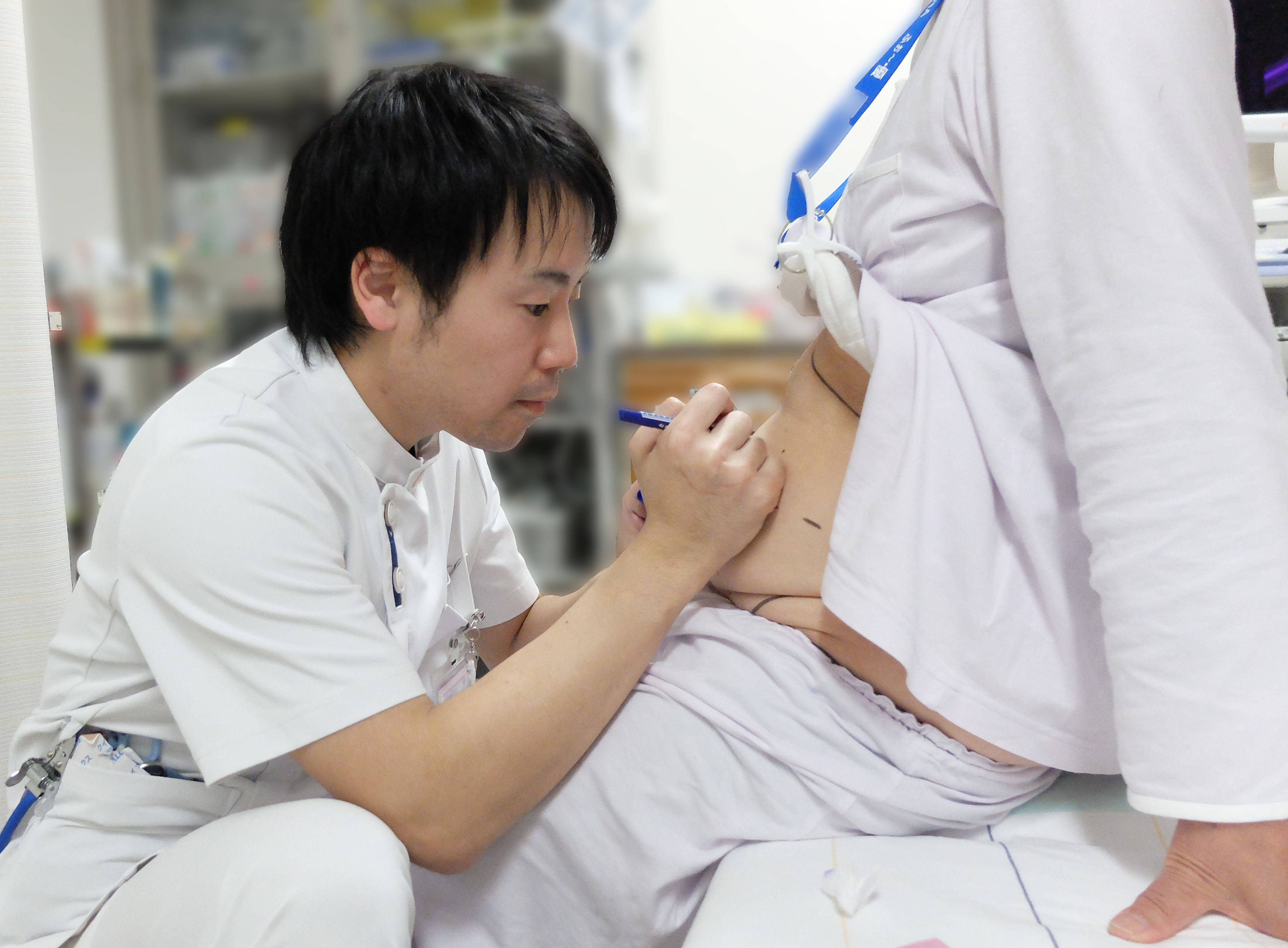 『ストーマの位置を決める様子』 :ストーマ―を造る位置はセルフケアがしやすいよう患者さんと一緒に決めていきます。 |
